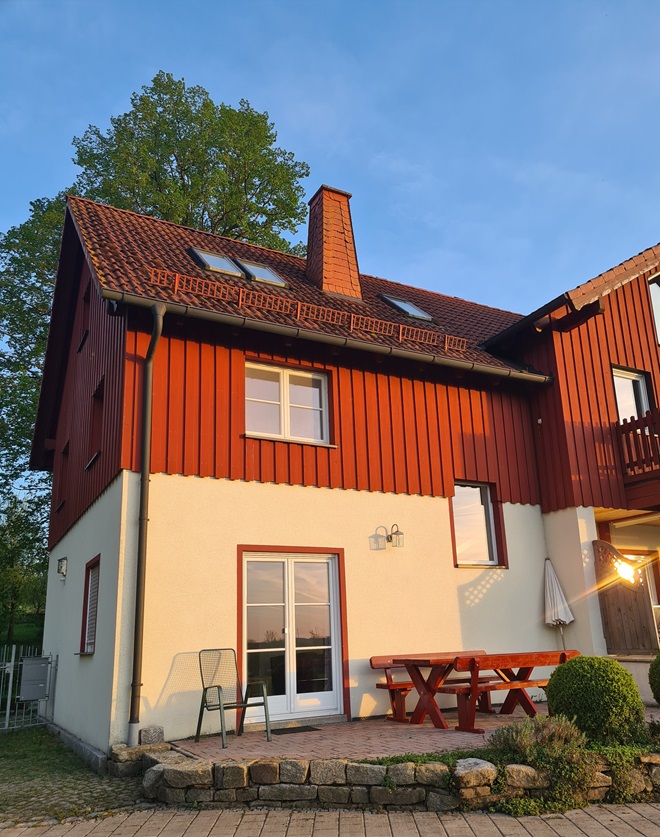 Erdgeschoss und 1. Stock, ca. 70qm große Wohnung mit Terrasse und Blick zum Förtmitzsee, 1 Schlafzimmer mit Doppelbett, 1 Schlafzimmer mit zwei Einzelbetten, große Wohnküche mit Couchecke und Essplatz, separates WC und Dusche mit WC.